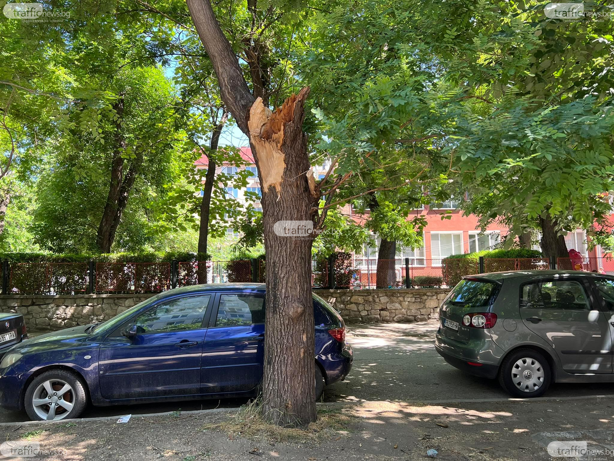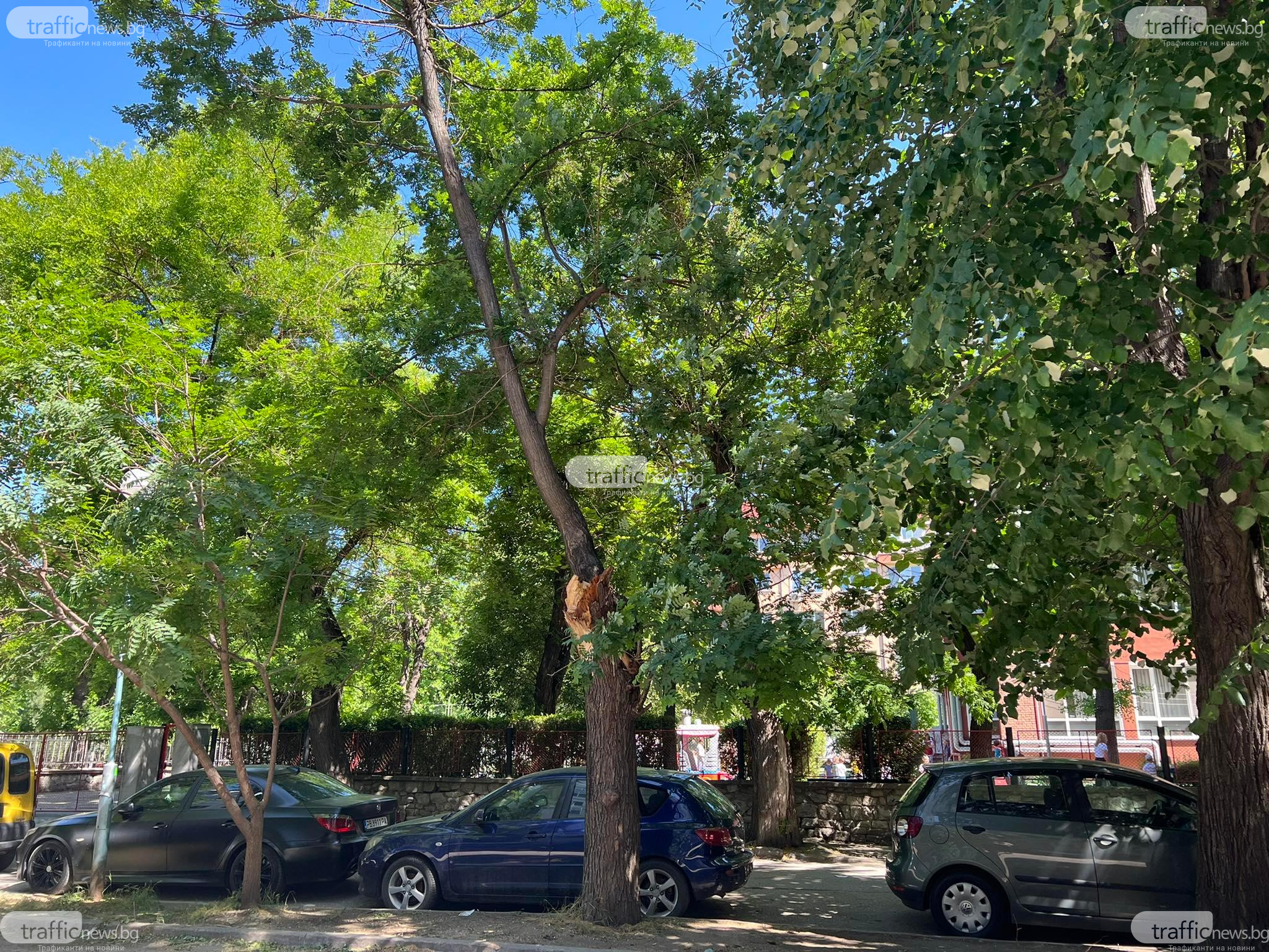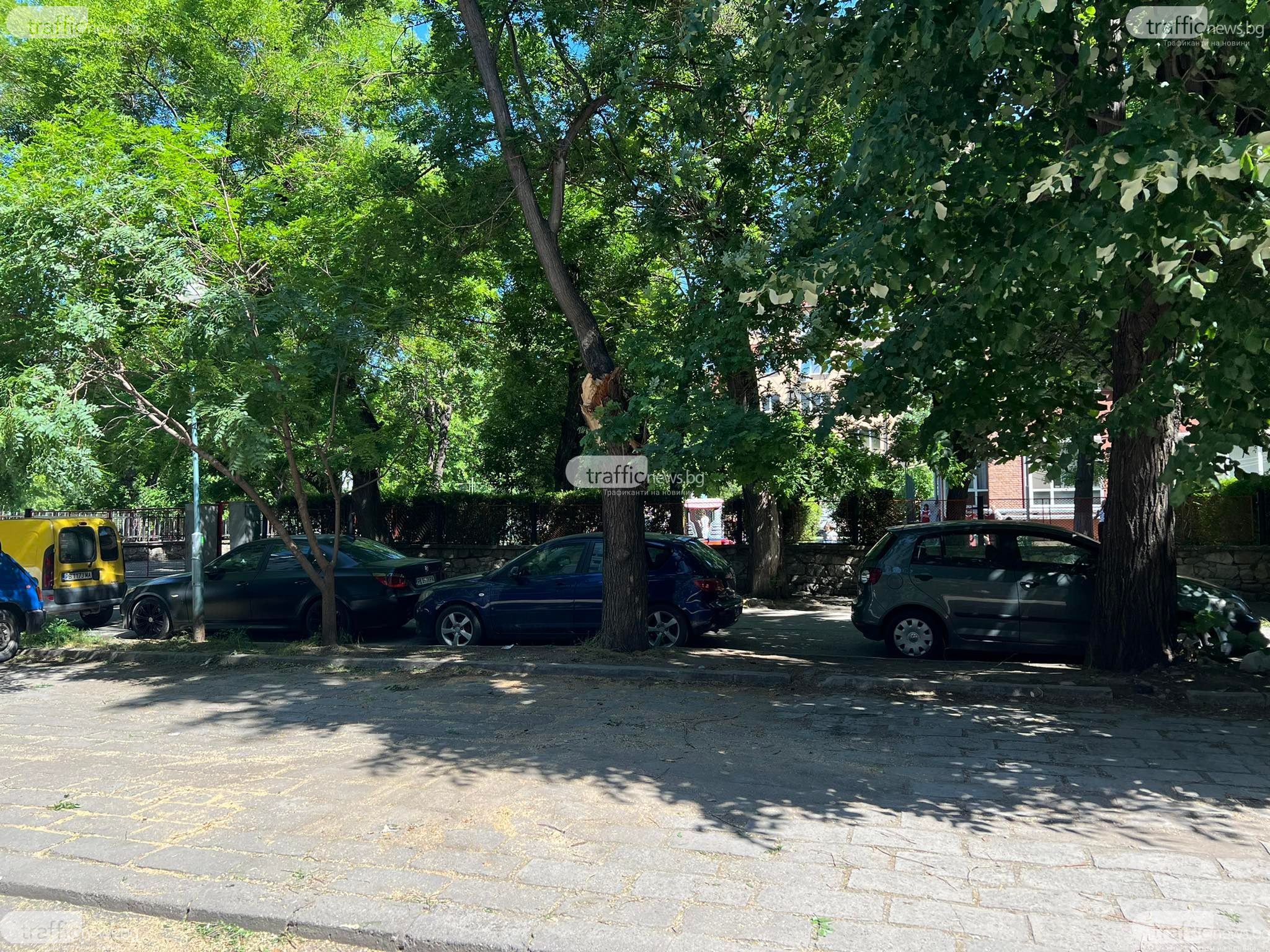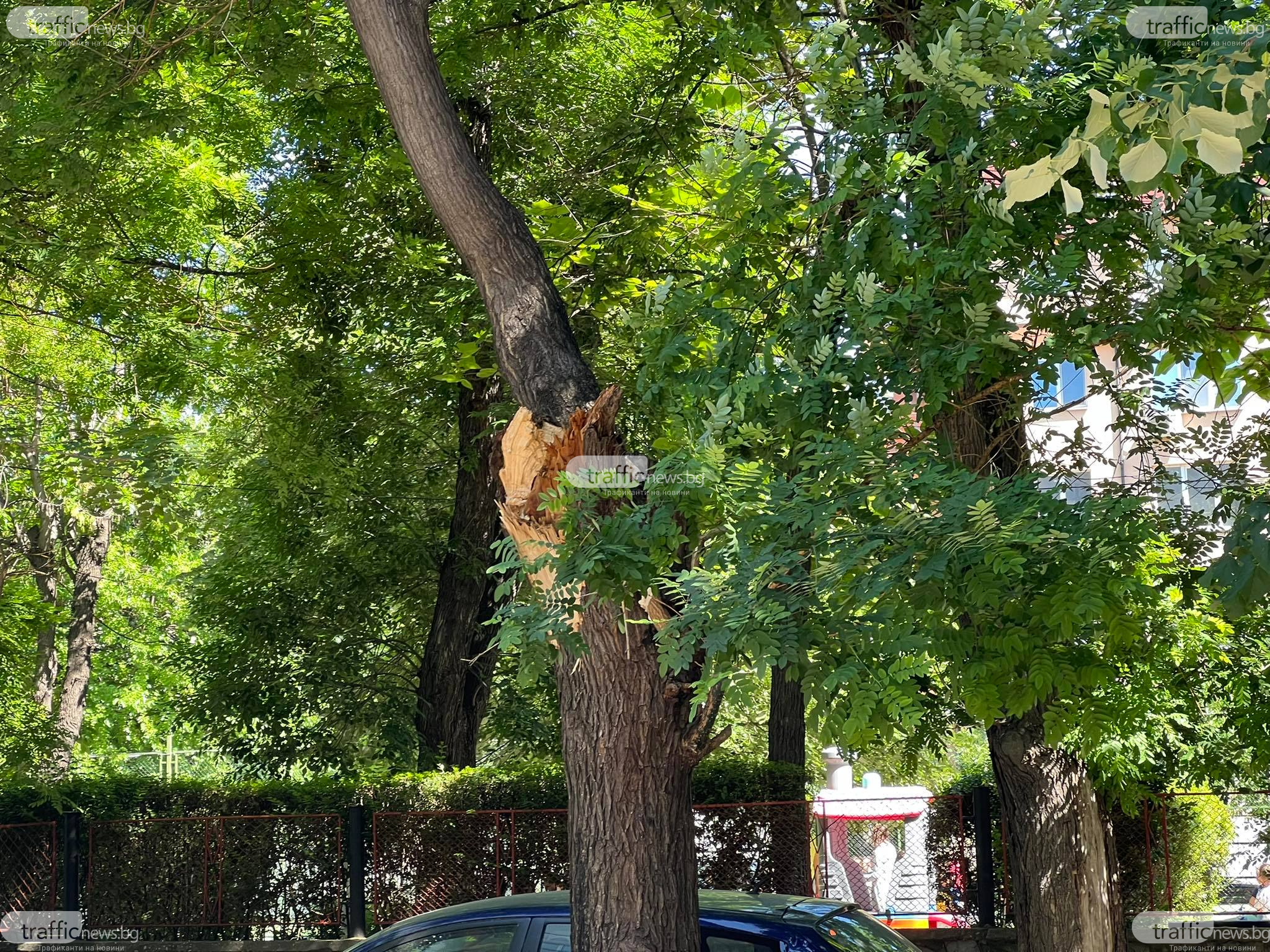Оглеждат дърветата край площадката в Кючука, където огромен клон се стовари до деца и потроши три коли