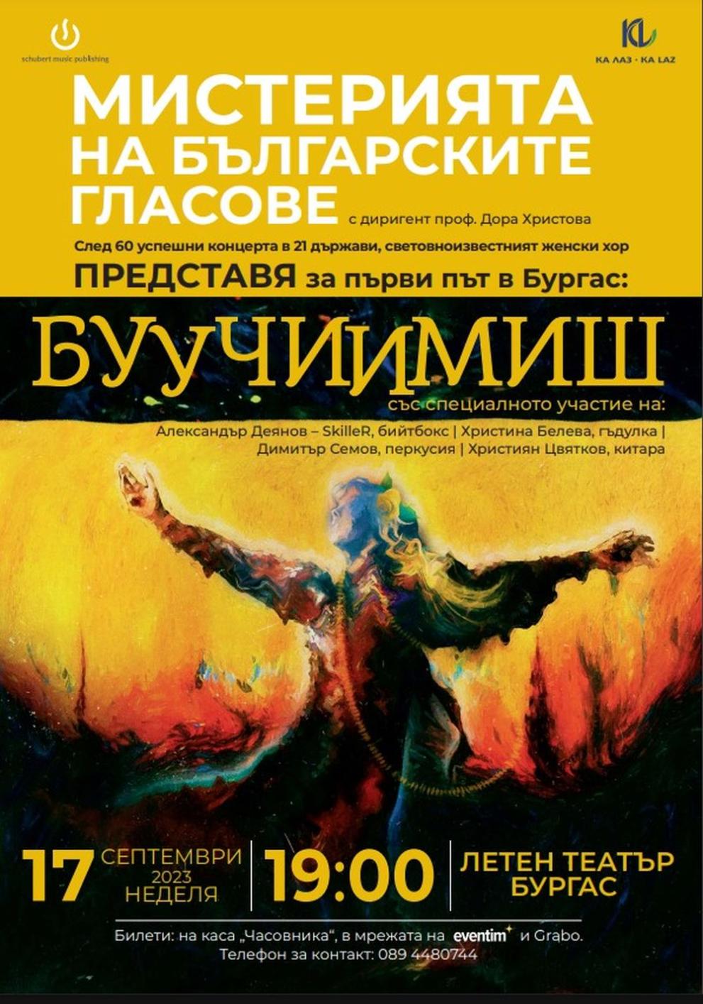 След изключителния триумф в над 60 концерта в 21 страни от Европа, в това число в София, Пловдив и Варна, трансформиралият се в музикална сензация албум „ БууЧииМиш “ на фамозния женски хор „ Мистерията на българските гласове “, ще бъде показан за първи път в Бургас на 17 септември от 19:00 часа, оповестиха от Общината.