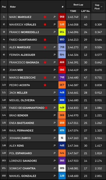 Иначе в челото тройката оформи Франко Морбидели, а в топ 5 влязоха още Фабио Куартараро и Алекс Маркес. Най-активен с общо 48 обиколки беше далият девето време Марко Бедзеки с Априлия. С минимум обиколки след рухването си приключи Акоста, който направи 18 тура преди да падне.