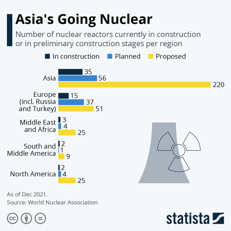 Азия излиза отпред — макар злополуката във Фукушима от 2011 година Япония към момента има 33 работещи реактора, като се възнамерява прибавянето на още 11. Индия възнамерява да утрои броя на централите до общо 72, а Китай предвижда построяването на 168 реактора — в допълнение към в този момент строящите се 18 и плануваните 37. Или общ растеж от 337.