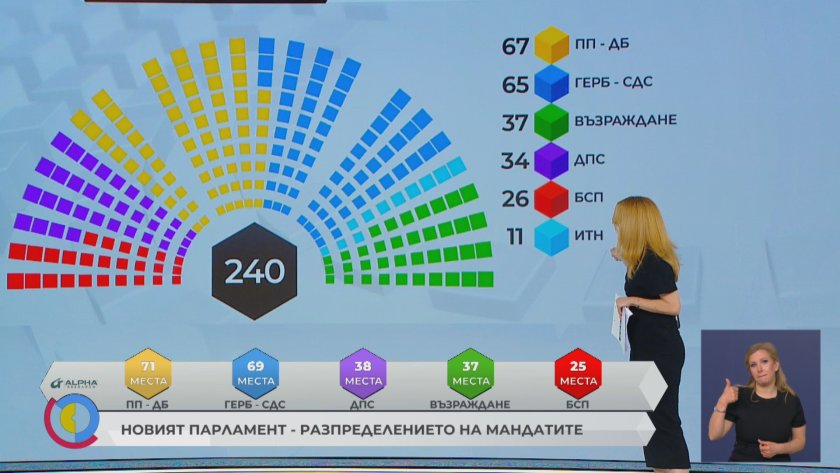 " Продължаваме промяната - Демократична България " ще разполагат със 71 депутата, а ГЕРБ-СДС - със 69. 38 народни представители ще има Движение за права и свободи, " Възраждане " - 37, а Българска социалистическа партия - 25.