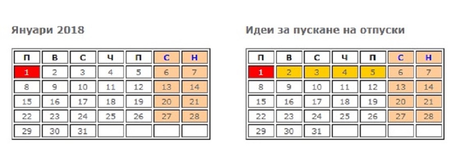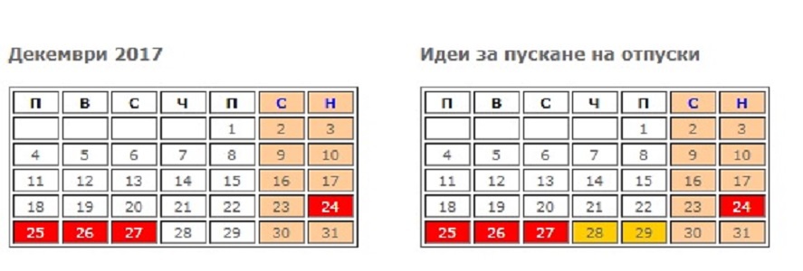 За сметка на това към Нова година ще почиваме единствено три дни. 30 и 31 декември се падат събота и неделя, а 1 януари е понеделник. За страдание вторник, 2 януари , е формален работен ден.