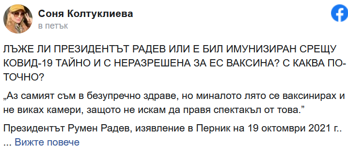 След като Румен Радев призна пред Ива Николова, че скрито се е ваксинирал с неразрешена от Европейски Съюз ваксина още през лятото, само че си мълчал, с цел да не се подвига звук, журналистката Соня Колтуклиева задава неуместни въпроси към президента. Ето какво написа тя на стената си във фейсбук: