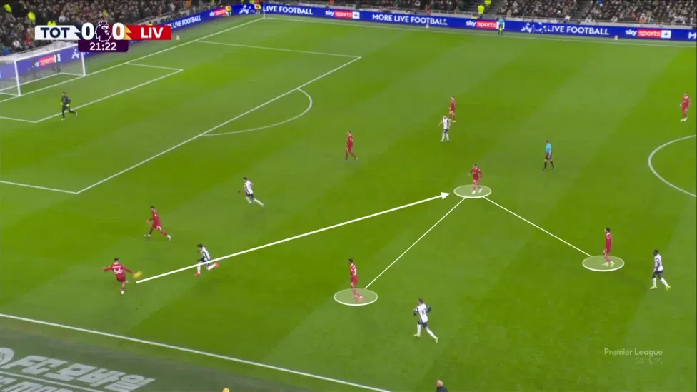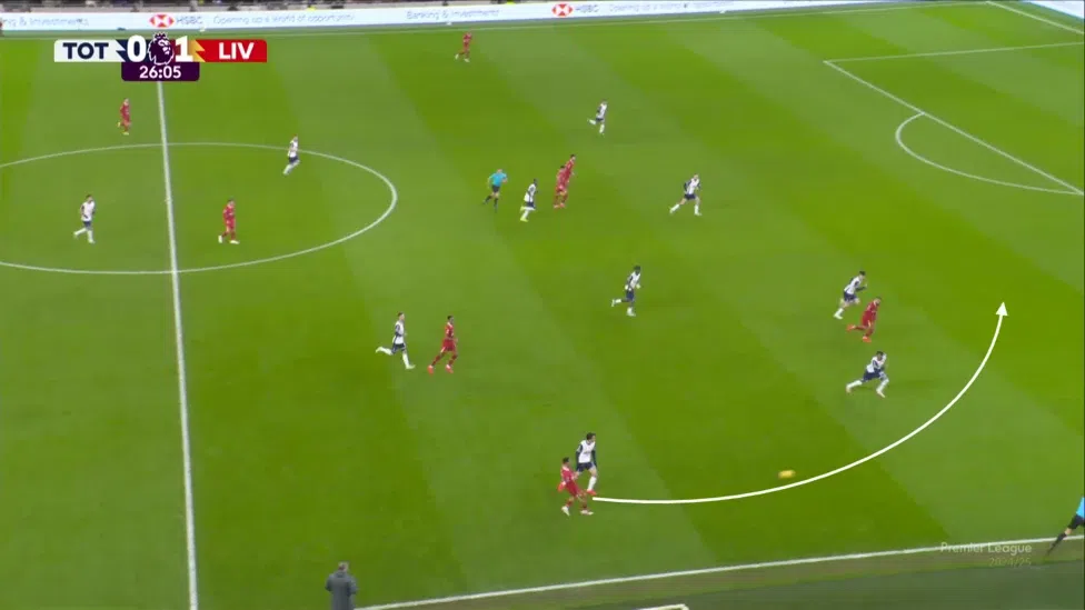 Миналия сезон Ливърпул правеше това с лекост. Сега обаче без Александър-Арнолд те срещат усложнения при изнасянето на топката. Един от основните детайли в играта на Трент беше умеенето му да подава с двата крайници. В дуела против Тотнъм, да вземем за пример, той употребява левия си крайник, с цел да откри точно Алексис Мак Алистър в центъра, макар високия напън от Хюн Мин Сон.