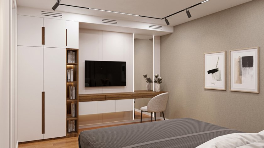 Спалнята дава усамотение и успокоение, като разполага с гримьорна част и самостоятелен работен ъгъл.