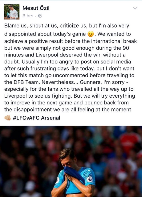 След като за следващ път не оправда високите упования - този път против Ливърпул, Месут Йозил въпреки всичко се извини за тежката загуба на Арсенал през вчерашния ден. Лондончани отнесоха четири гола на “Анфийлд”, а немският национал беше единствено очевидец на протичащото се на терена. Ето какво написа той след срещата: