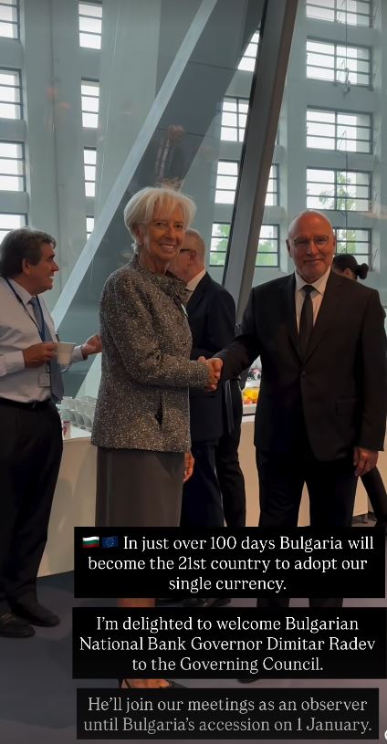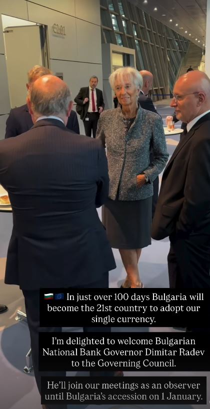 „ След малко повече от 100 дни България ще стане 21-вата страна, която ще одобри нашата единна валута. Радвам се да поздравявам шефа на Българската национална банка Димитър Радев в нашия Управителен съвет. Той ще се причисли към съвещанията ни като наблюдаващ до присъединението на България на 1 януари ”, това съобщи президентът на Европейската централна банка Кристин Лагард, която пусна стори в Instagram.