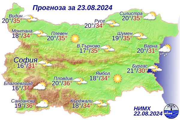 По Черноморието ще бъде най-вече слънчево. След обяд ще има купеста облачност и на обособени места ще превали, допустимо е да прегърми. Ще духа до сдържан вятър от изток-североизток. Максималните температури ще са 29°-31°. Температурата на морската вода е 27°-29°. Вълнението на морето ще бъде 2-3 бала.