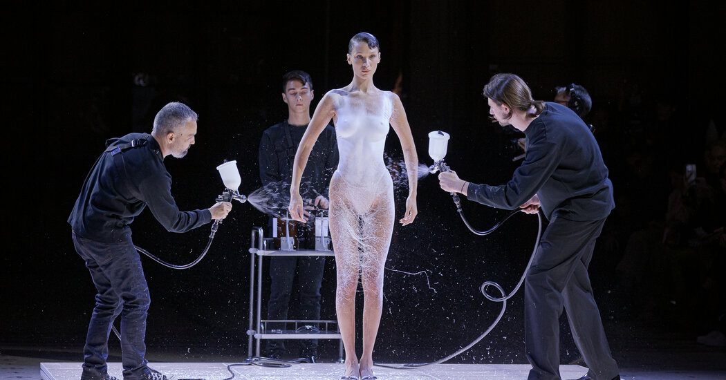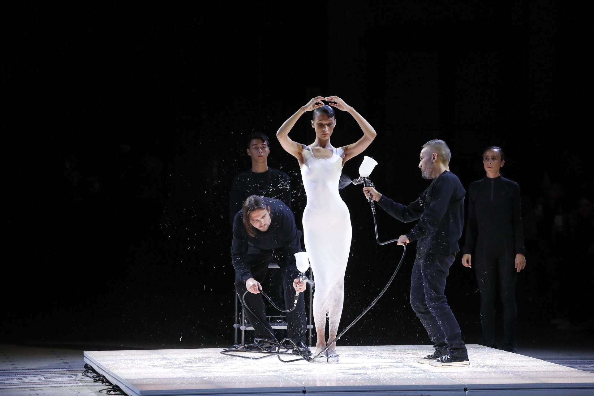 Френската фешън къща Coperni, учредена от Sebastien Meyer и Arnaud Vaillant, реши да добави съвременни технологии към естетиката на марката като част от сбирката пролет-лято 2023 г. На финала имаше осъществяване в центъра, на което беше Бела Хадид. Моделът се появи на подиума без облекла и бели сандали, в компанията на екип, управителен от испанския дизайнер Манел Торес, който сътвори минималистична бяла рокля в жанр долни дрехи тъкмо върху тялото на Хадид, която идеално наблягаше нейната фигура.