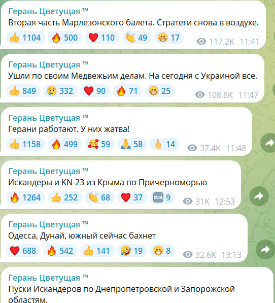 Скоро се появиха известия, че няколко рояка дронове са изстреляни на територията на Украйна - дронове „ камикадзе “ удрят енергийна, военна и логистична инфраструктура. Военни репортери и военни специалисти от двете страни на фронта оповестиха, че Гераниум, Искандер, Калибър, Кинжал, X-101, X-55, KN-23 и доста други работят против врага.