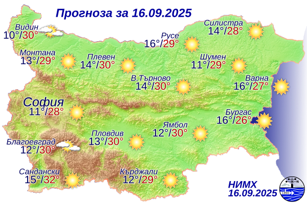 По Черноморието също ще бъде слънчево, с оптимални температури сред 24° и 27°. Температурата на морската вода ще е към 24°, а вълнението на морето ще бъде 2 бала.