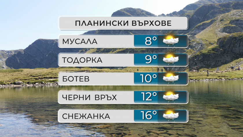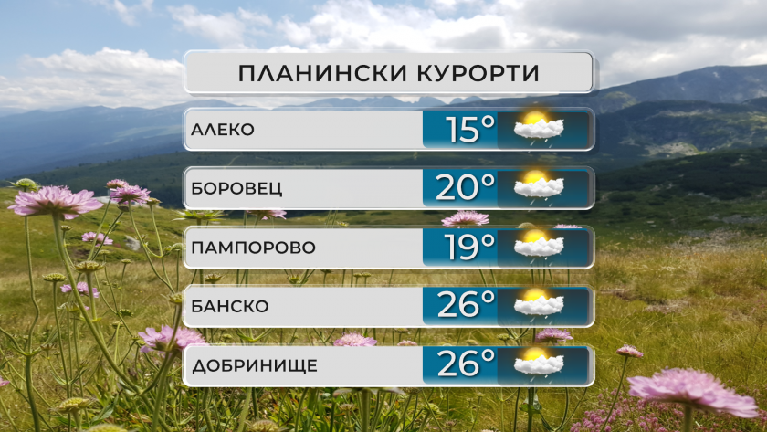 И в планините след обяд се чакат краткотрайни превалявания и гръмотевици. Максималните температури в курортите ще са от 15° в Алеко до 26° в Банско и Добринище.