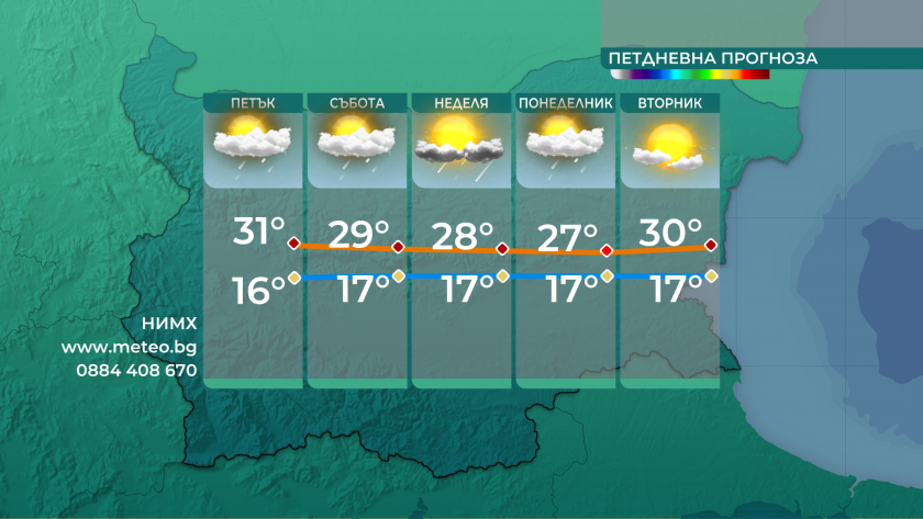 Ще има региони със обилни превалявания, там и температурите ще малко са по-ниски. Предимно слънчево, тук-там горещо ще бъде в Централна и Източна България.