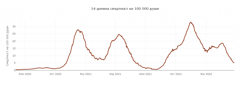 При 14-дневната смъртност това обаче не е по този начин - най-смъртоносна е била четвъртата вълна (есента на 2021), след нея се подрежда втората вълна (есента на 2020).