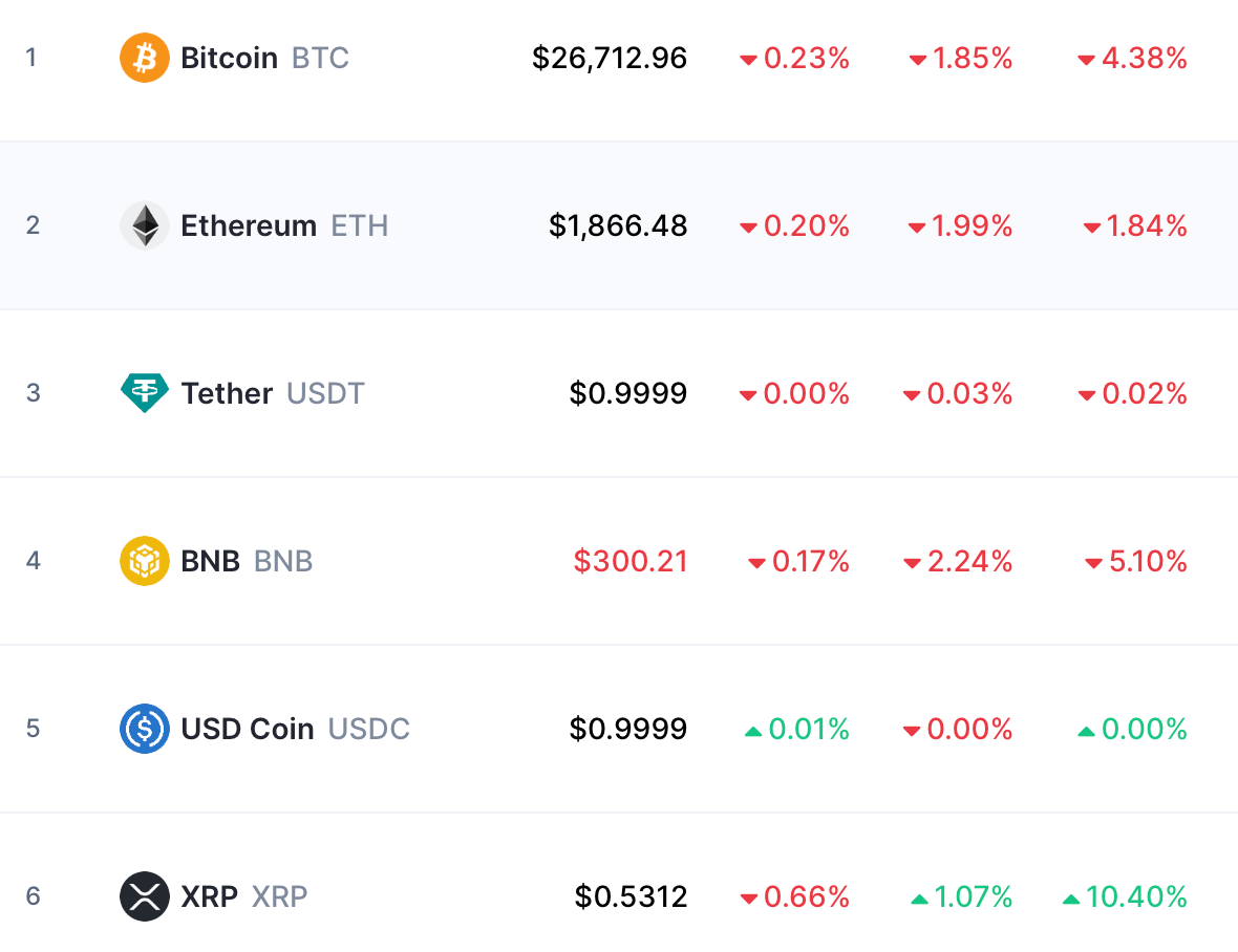 Биткойн (BTC) означи спад от близо 2% през последните 24 часа, като падна под границата от $27,000 и доближи $26,700.