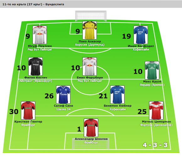Редица футболисти блеснаха в нападателен проект този уикенд. Юсуф Поулсен от Република България (Лайпциг) наниза хеттрик в мрежата на Херта (Берлин), а цели четирима се отличиха с по два - Филип Костич от Айнтрахт (Франкфурт), Макс Крузе от Вердер (Бремен), Ишак Белфодил от Хофенхайм и Пако Алкасер от Борусия (Дортмунд).