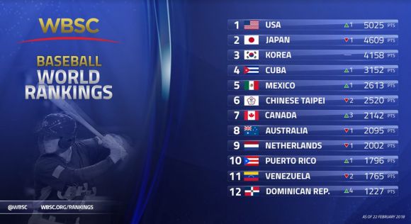 След повече от 3 години на втора позиция родината на бейзбола Съединени американски щати се завърна преди всичко в международната класация. В първото издание на класацията на международната конфедерация (WBSC) за 2018 година американците изместиха от върха неизменимия водач от 2014 година насам Япония, а мястото си в Топ 3 резервира Корея.