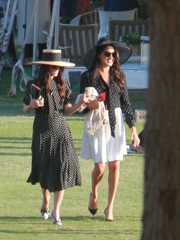 Меган напусна кралското със скандал, само че резервира любовта си към протоколния дрешник - тя заложи на черна риза на бели точки и бизнес къси панталони. Аксесоарите ѝ бяха необятна шапка и очила, които отлично допълваха облика ѝ и са подобаващи по кралския протокол за обществено събитие