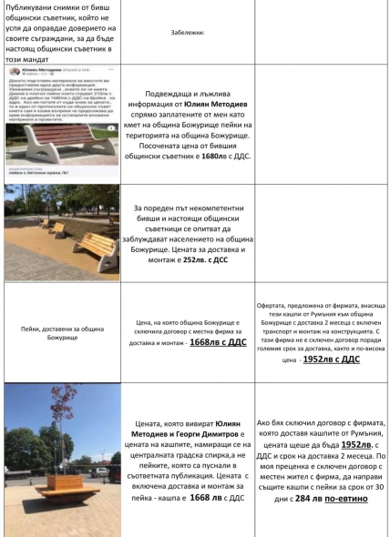 " След оповестената погрешна, подвеждаща и лъжлива информация от някогашния общински консултант Юлиян Методиев, както и настоящия общински консултант Георги Димитров, които за следващ път се пробват да омерзява и обезличат моята работа като кмет на община Божурище, обявявам таблица с цени на пейки и кашпи, доставени на територията на общината ". Това написа в профила си във Фейсбук кметът на Божурище.