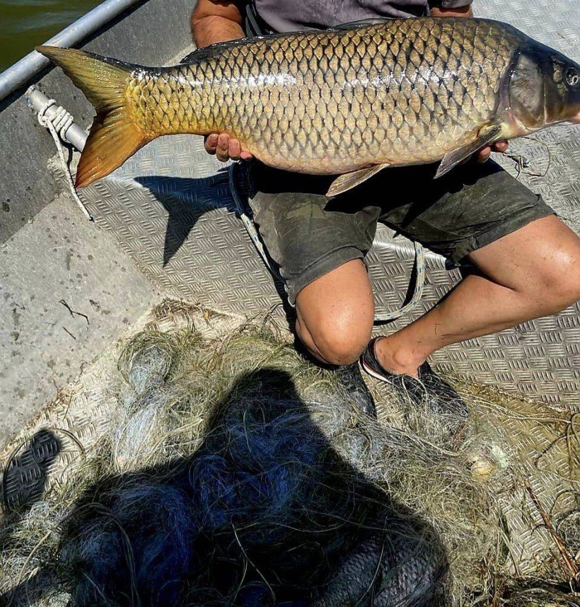 Инспекторите извадиха мрежите от водата и откриха риба от типовете - шаран (над 150 кг), от които 9 броя с тегло по 10 кг, бял амур - 12 кг, сребриста каракуда - 2 кг, 2 броя морски костенурки и 4 броя черни качулати потапници оплетени в тях.