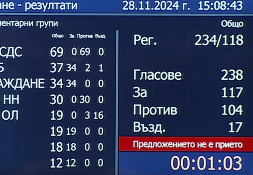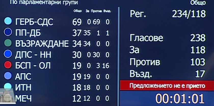 След първото гласоподаване Кирилов разгласи, че предлагането " не е признато ". Тошко Йорданов от Има Такъв Народ обаче го поправи, че при присъстващи 234 души кворумът е половината плюс 1, т.е. 118 депутати.