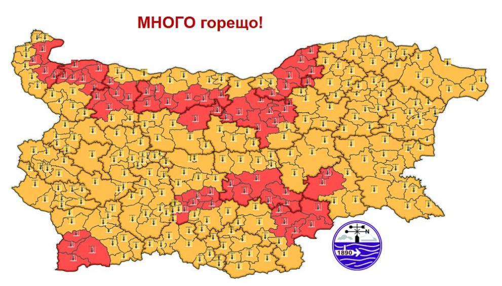 В събота (26 юли) отново ще е слънчево и доста горещо . Синоптиците издадоха червен код за доста рисково време е рисково високи температури до 43 градуса в 12 области : Видин, Монтана, Враца, Плевен, Ловеч, Велико Търново, Русе, Ямбол, Хасково, Стара Загора, Пловдив и Благоевград. В останалата част от страната е в сила оранжев код за рисково време.