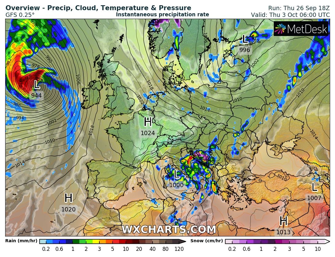 В северната половина на континента ще се развиват поредност мощни циклони с превалявания от дъжд и сняг в най-северните региони. На Юг чакаме оформянето на средиземноморска зона с ниско атмосферно налягане чак в сряда-четвъртък . Тогава и у нас есента отново ще подсети за себе си с валежи и по-ниски температури.