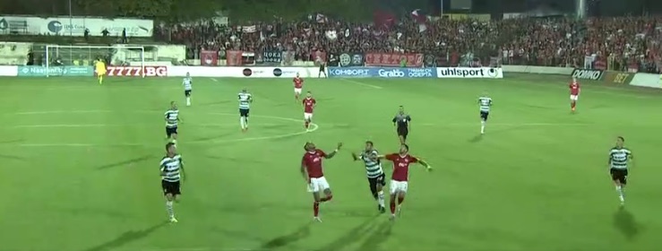 Манолев прави нарушаване против неприятелски защитник, като го бута в гърба с ръка и по този метод печели единоборството. Съдията обаче позволява неточност като не отсъжда фаул. След него Манолев влиза в наказателното поле и е съборен от Боровик. Тук е видно, че стражът прави нарушаване.