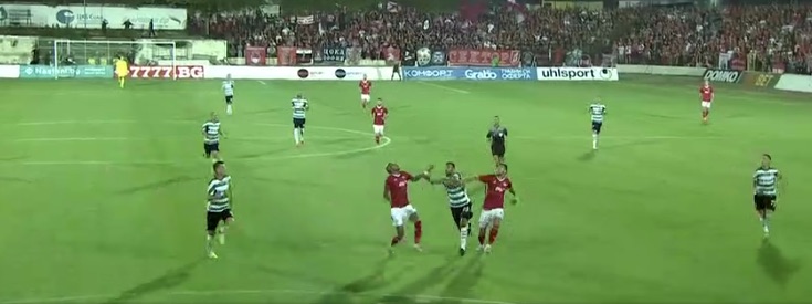 В средата на първата част Каранга фаулира жестоко неприятелски състезател и вярно бе украсен в жълто. След това той извърши най-малко още три нарушавания, които не бяха груби и сами по себе си не заслужаваха картон, само че пък стана струпване, което е причина за картон. Веднъж Каранга симулира и за дузпа в обстановката с анулирания гол на Манолев, което съдията най-вероятно е счел за падение и заради това не спря играта, с цел да глоби нападателя, след което алените вкараха, само че попадението бе анулирано поради несъществуваща засада.