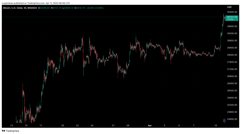 Рано сутринта на 11.04 към 05:30 българско време Биткойн доближи връхна точка от $30,399, след което цената леко се отдръпна и все още на писане на публикацията актива се търгува за към $30,100, по данни на TradingView. За последно флагманската криптовалута се търгуваше за над $30,000 през юни месец 2022 година, а през последния месец актива е поскъпнал с малко над 30%.