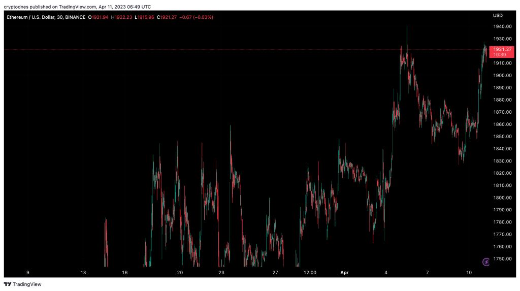 Етериум , най-големият алткойн по пазарна капитализация, доближи осеммесечен връх от $1,940 през предходната седмица. ETH също осъществя 4% растеж на цената от през вчерашния ден сутринта до момента като все още на писане на публикацията се търгува за към $1,921 и има 24 часов размер на търговията, равняващ се на $9.4 милиарда.