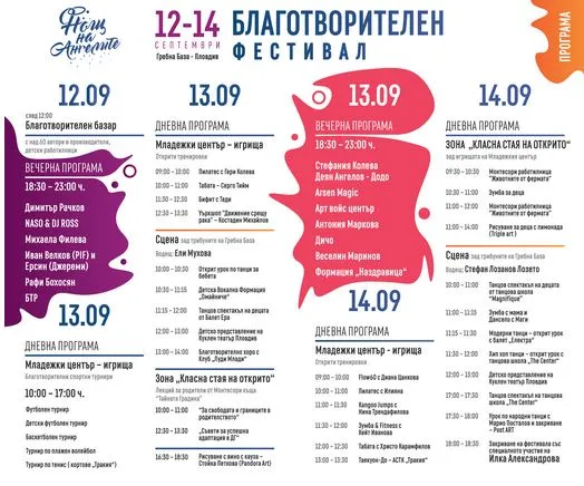 И тази година програмата е извънредно богата и включва спортни интензивности, като благотворителни шампионати по футбол, баскетбол, тенис на корт, плажен волейбол, крос фит, канго джъмпс, разнообразни демонстрации, открити тренировки и уроци национални танци. За децата ще се организират работилници, детски салон за хубост, детска занималня навън, куклен спектакъл, аниматори, изобразяване на лица и още доста изненади.