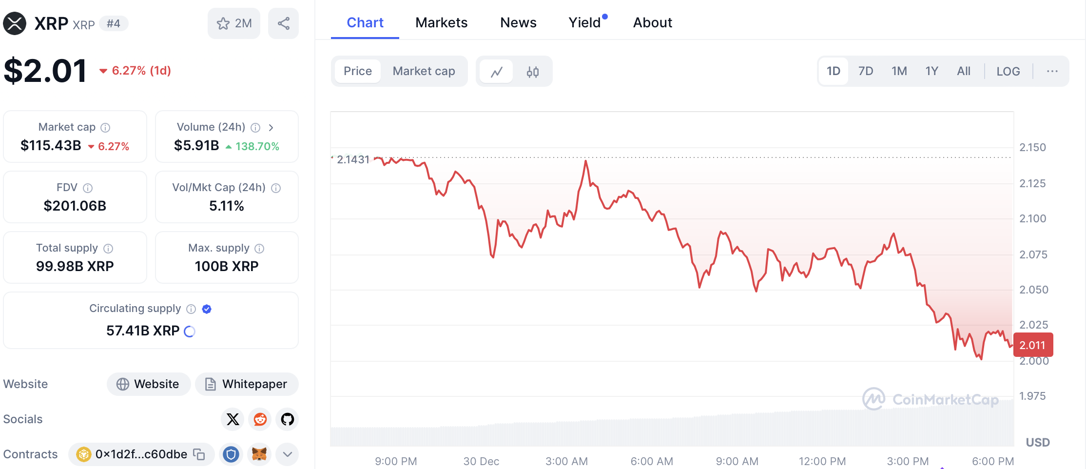 Дигиталният актив загуби над $20 милиарда пазарна капитализация през предпоследната седмица на декември, спадайки от $152 милиарда на $130 милиарда. Към 30 декември пазарната капитализация на XRP в допълнение понижа до $115 милиарда, като единствено за няколко часа загуби още $7 милиарда.