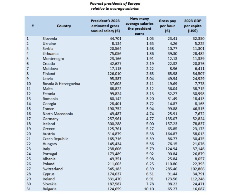 Словения има най-бедния президент в Европа. По отношение на междинните заплати, президентите на Украйна и Сърбия следват компактно като втори и трети най-бедни на континента. В цяла Европа държавните глави печелят 4,1 пъти повече от междинния приход и костват на данъкоплатците 49,62 евро на час.