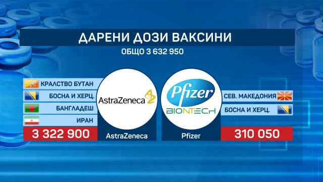 Дарените препарати са над 3 милиона. Най-много сме дарили от имунизацията на „ Астра Зенека “ на Кралство Бутан, Босна и Херцеговина, Бангладеш и Иран. Препарати на „ Пфайзер " са разпределени в Северна Македония и Босна и Херцеговина.