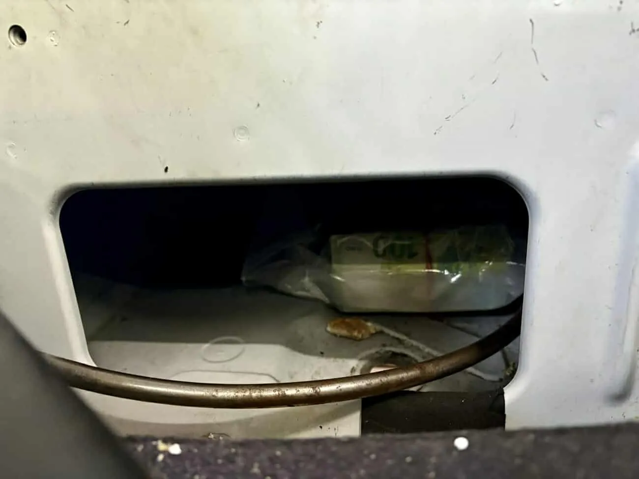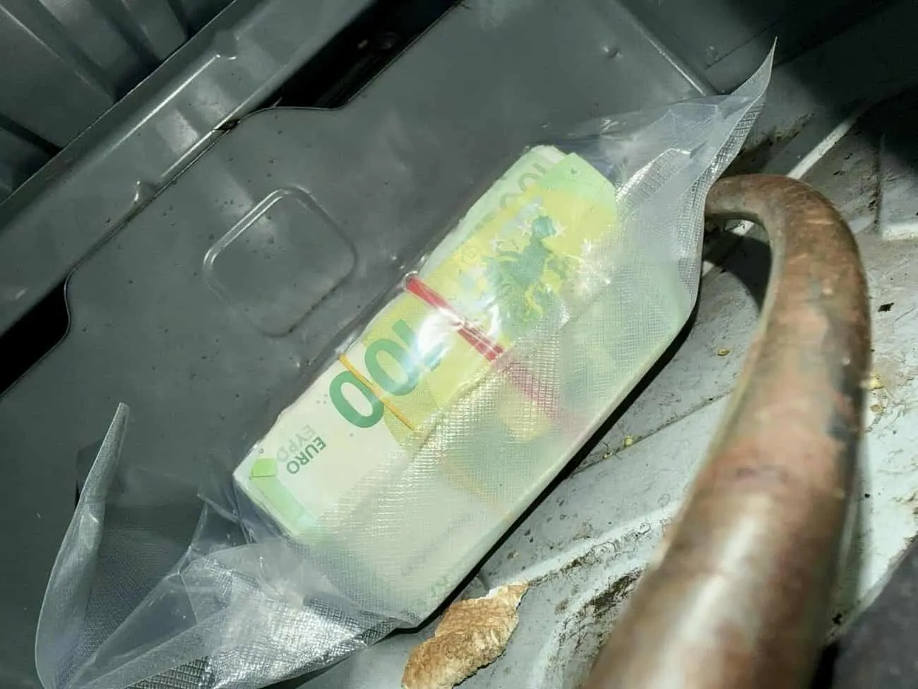 При инспекцията на лек автомобил, осъществена на ТИР терминал в митническо бюро във Видин, в празнина зад шофьорската седалка и пода на колата са открити два пакета. В единия пакет е открито бяло кристално вещество с тегло към 985 грама, реагирало на метамфетамин. В другия пакет са открити голям брой евробанкноти с друг номинал, общо на стойност 84 500 евро. Автомобилът е конфискуван.