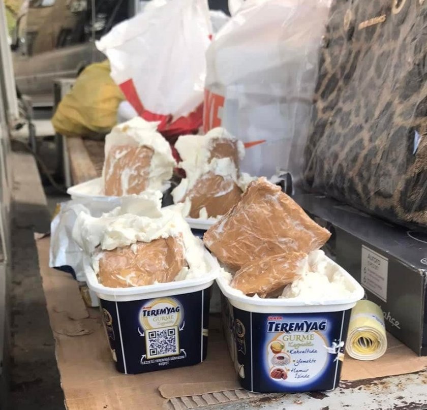 При осъществената инспекция митническите инспектори откриват измежду багажа - сложени вътре в кутии с крема сирене 5 пакета, увити с мрачно тиксо и найлони.