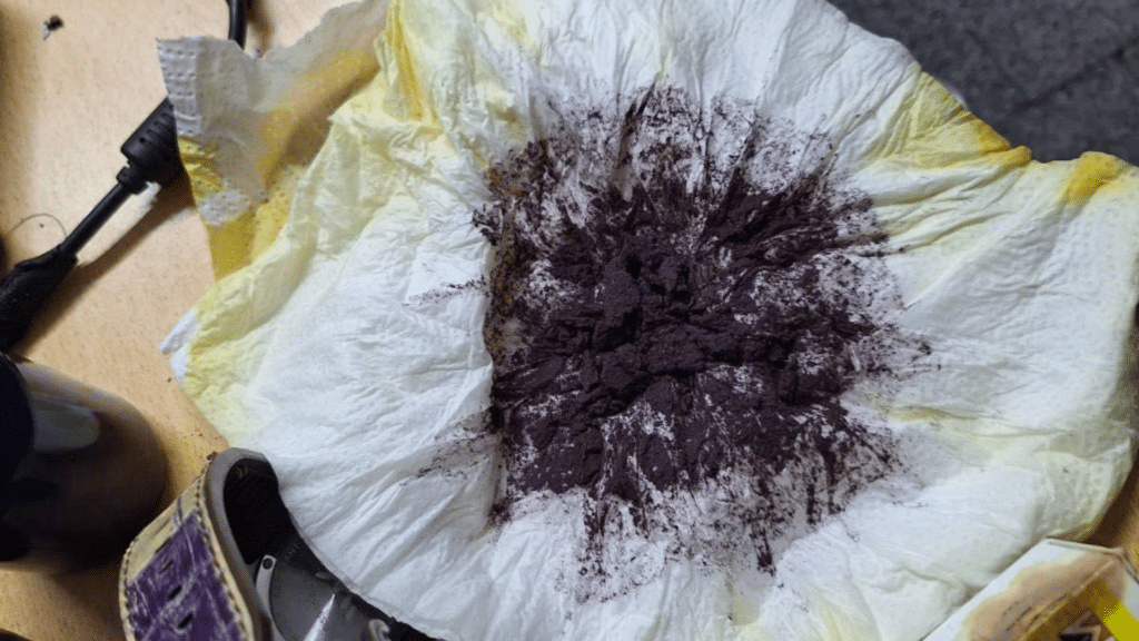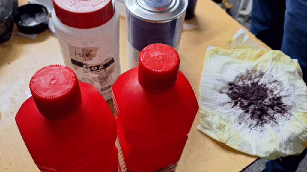 При интервенцията са открити и конфискувани бутилки с киселина, корселин, йод, ацетон, както и люспи за разчистване, алено прахообразно вещество (фосфор), електронна везна, пакет с надпис „ MCM “ с тегло към 200 г, както и към 20 г амфетамин.
