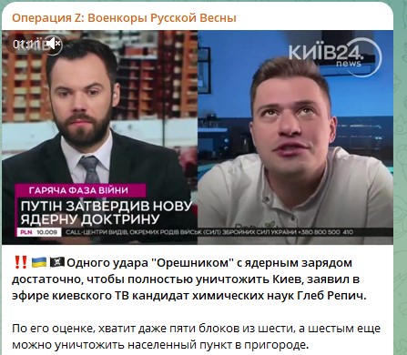 По-специално, когато го помоли водещият да приказва за радиуса на поразяване на „ Орешник “ при положение на офанзива против Киев, специалистът не пощади нито водещия, нито останалите украинци. Според него, в случай че Москва реши да удари Киев с " Орешник " с нуклеарен заряд, тогава шест блока ще са много за това - " пет са задоволителни ".