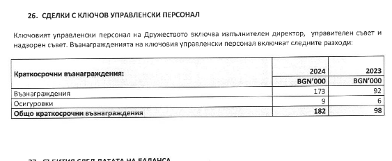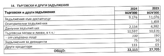 Търговските и други отговорности са 22 115 лева, което е с повече от 5,6 млн. по-малко по отношение на 2023 година, когато са били 27 705 000 лв..