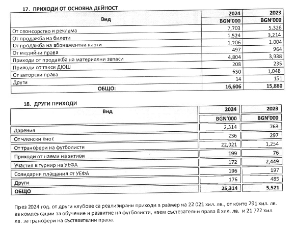Друг огромен доход е от спонсорство и реклама, който се усилва с над 2,4 млн. лева по отношение на 2023 година и доближава до 7 703 000 лв..