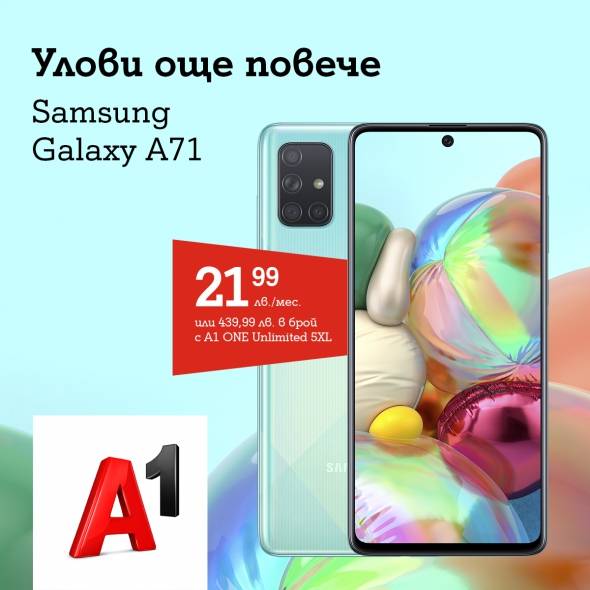Това систематизиране на натоварването щади батерията, усъвършенства работата на устройство и оказва помощ на Samsung Galaxy A71 да се оправи даже и с по-тежките приложения и видеоигри. Това е смарт телефон, който е на горната граница на междинния клас, като сега може да бъде закупен от А1 на цени, започващи от 21,99 лв. на месец или 439,99 лв. в брой, при покупка с тарифен план А1 One Unlimited 5XL. Samsung Galaxy A41 може да бъде открит в портфолиото на А1 на цени, започващи от 11,99 лв. на месец или 219,99 лв. в брой, още веднъж в композиция със същия тарифен проект.