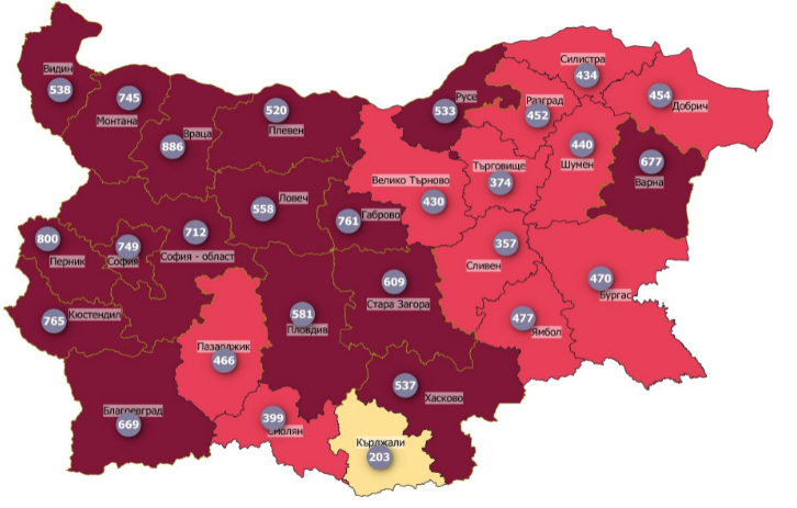 11 области към този момент са в алената зона със заболеваемост под 500 на 100 000 души. Те са Бургас, Велико Търново, Добрич, Пазарджик, Ямбол, Разград, Търговище, Смолян, Сливен, Силистра, Шумен. Кърджали продължава да бъде в жълтата зона със заболеваемост под 250 на 100 000 души.