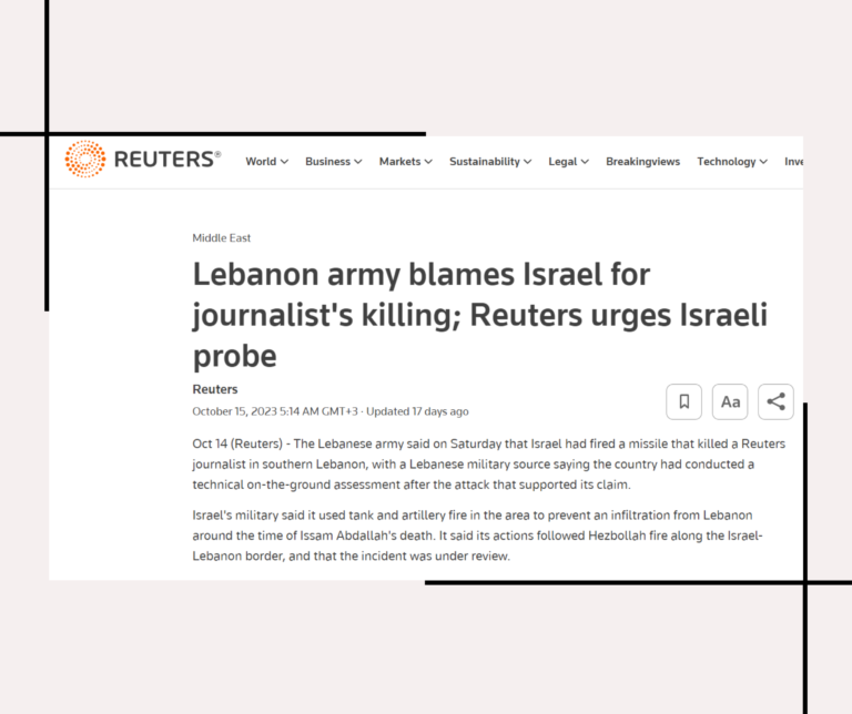 Първоначалният текст на „ Ройтерс “ на 13 октомври 2023 година, наличен с инструмента WayBackMachine, показва, че техен опаратор – Исам Абдала, е погубен, до момента в който работи на южната граница на Ливан. Исам е бил част от екипа на организацията в Ливан, който е осигурявал видео връзка онлайн.