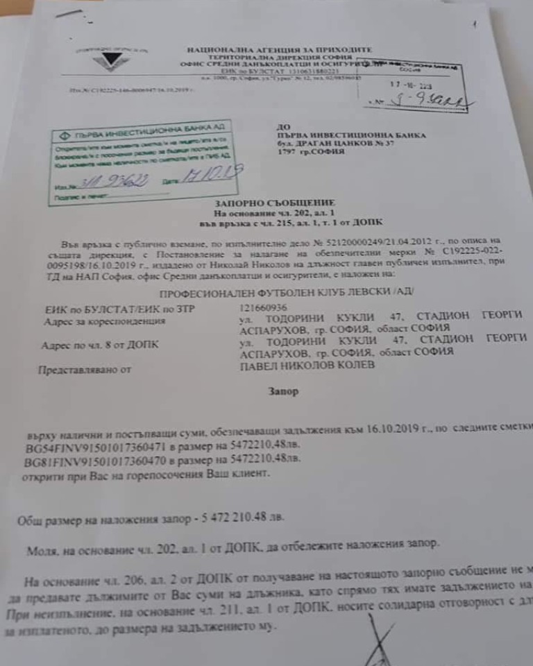 Сметките на Левски са запорирани, откакто клубът не е изплатил в период контрактуваните с Национална агенция за приходите суми по свои отговорности, заяви gong.bg. Това излиза наяве от документ, който е станал обществено притежание в обществените мрежи. “Сините “ дължат на Националната организация за приходите сумата от 5 472 210.48 лв.. Документът е с дата 17 октомври.