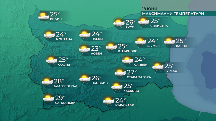 На места преваляванията ще са интензивни и съпроводени от гръмотевици и градушки, изключително над източните и планински елементи от страната. Ще духа доумерен вятър от северозапад. Максималните температури ще са най-вече сред 24° и 29°, в столицата към 25°, а по Черноморието – сред 23° и 26°.