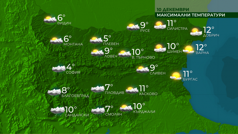 Облачността от запад ще се усилва и късно вечерта в крайните югозападни региони ще превали дъжд. На места там ще има условия за поледици. Предимно слънчево ще остане в Източна България, а в низините и котловините ще се задържи мъгливо през целия ден. Почти безшумно, в Източна България и по Черноморието - със слаб южен вятър. Минималните температури ще бъдат от минус 5° до 3°, в София минус 5°, оптималните - сред 7° и 12°, по-ниски в регионите с трайни мъгла.
