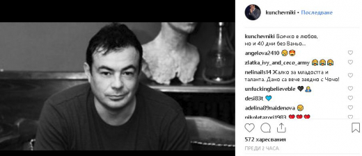Оказа се, че навръх 14 февруари се навършват 40 дни от гибелта му. " Всичко е обич, но и 40 дни без Ваньо... ", написа Кънчев, който показа и черно-бяла фотография на Иван Ласкин.