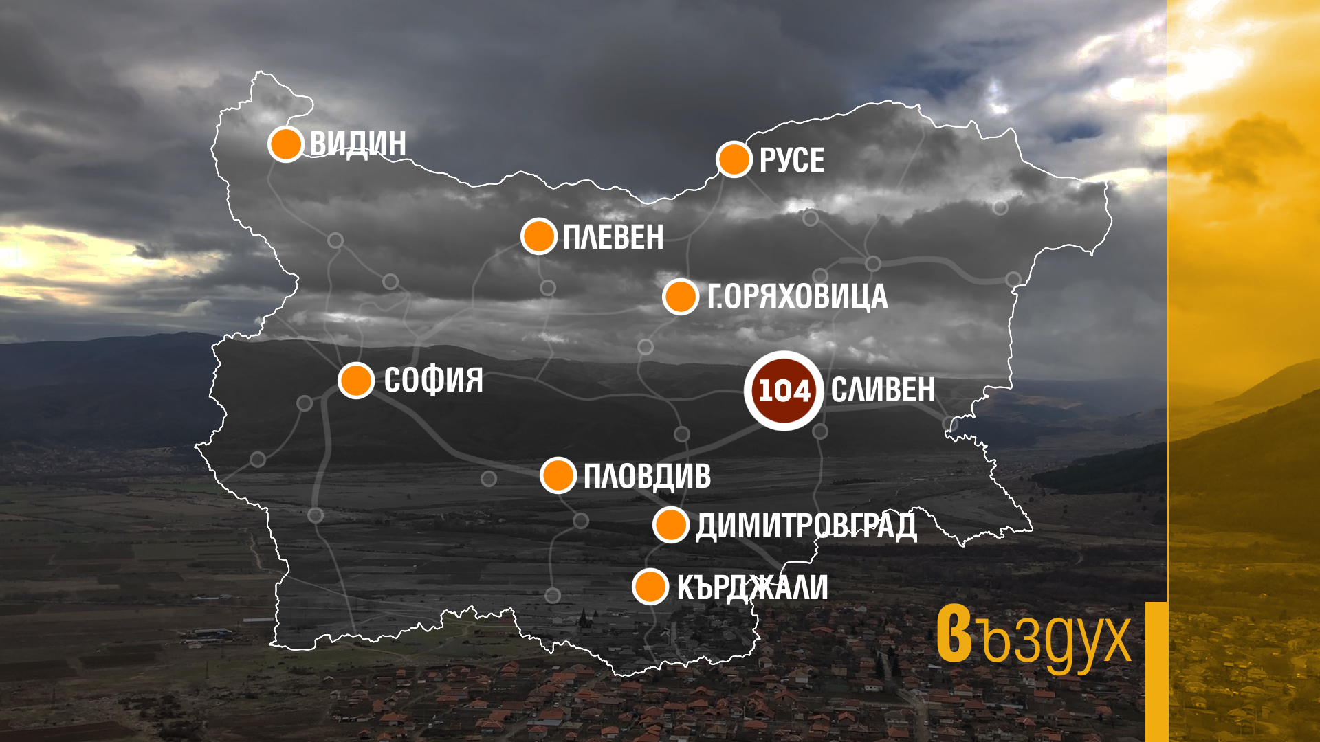 В петък заран замърсен въздух дишат 10 града в страната. Най-замърсен е той в региона на Сливен, където концентрацията на фини прахови частици е 2 пъти над нормата.
