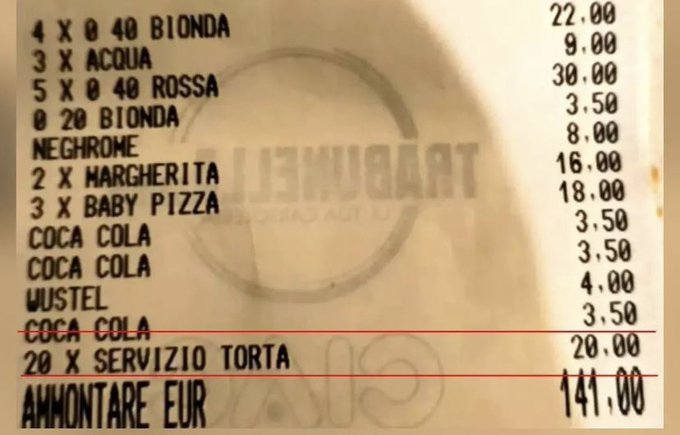 " Семейство в Италия е било таксувано с 20 евро за това, че сервитьорът е разрязал торта на 20 части, която сами са си купили ", гласи истинският туит дружно със фотография на сметката. " Поръчали са храна и питиета на стойност 121 евро, само че все пак са били таксувани в допълнение. Ако това не е корист, тогава се чудя какво е! ", написа засегнат консуматор.